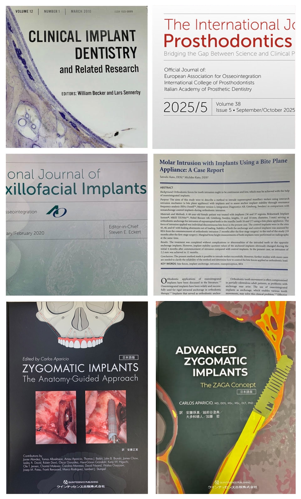 - 加藤 哲.補綴用インプラントをアンカーとして用いた限局矯正症例.佐藤元彦、竹内豊、亀田晃、酒井信夫編集。日本成人矯正学会編 成人矯正歯科治療。クインテッセンス出版株式会社、東京; 2014:196-199.
