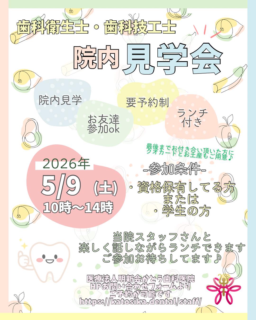 | 資格、条件 | ・歯科衛生士 ・歯科衛生士専門学校または衛生士学科在学中(卒業見込み証明書必須) |
